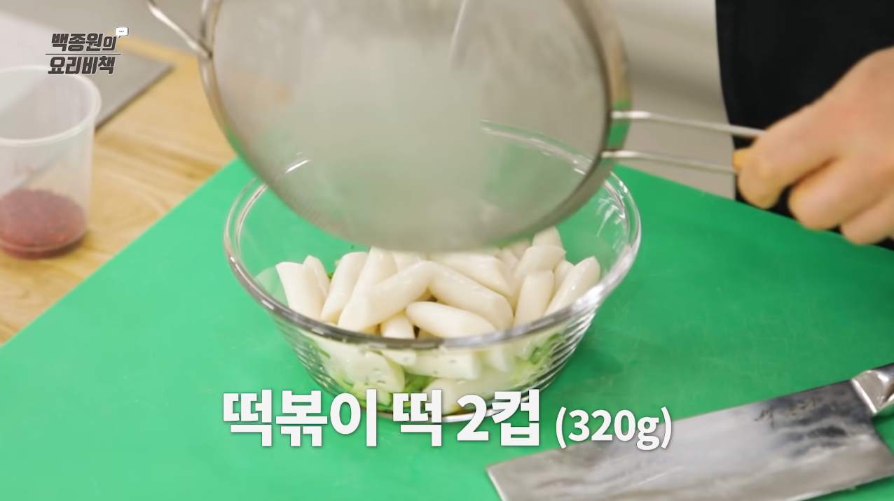 떡볶이떡은 깊은 볼에 담아 물에 씻은 후 체에 밭쳐 물기를 제거한다.