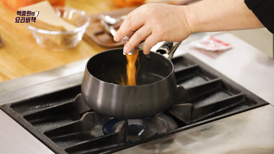 냄비에 물, 라면스프, 건더기스프를 넣고 강 불에 끓인다.