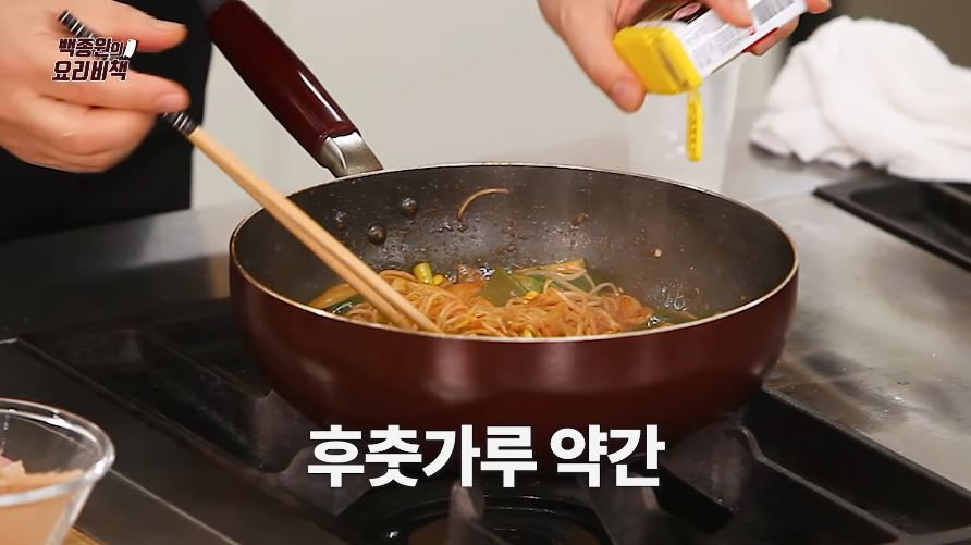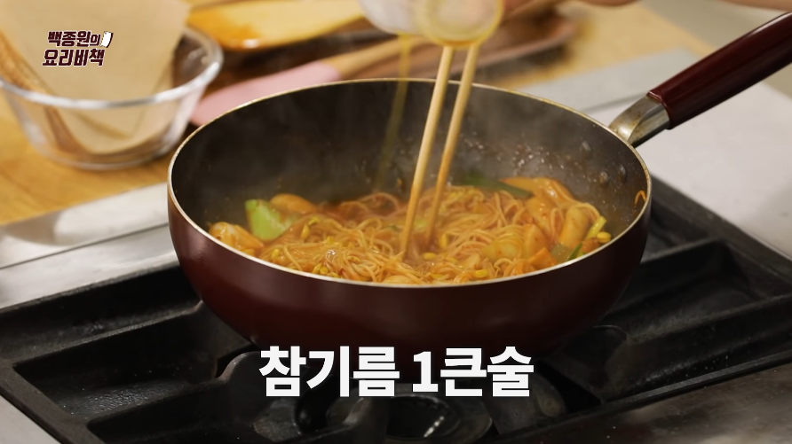 농도가 잡히면 불을 끄고 참기름, 후춧가루를 뿌려 섞는다.