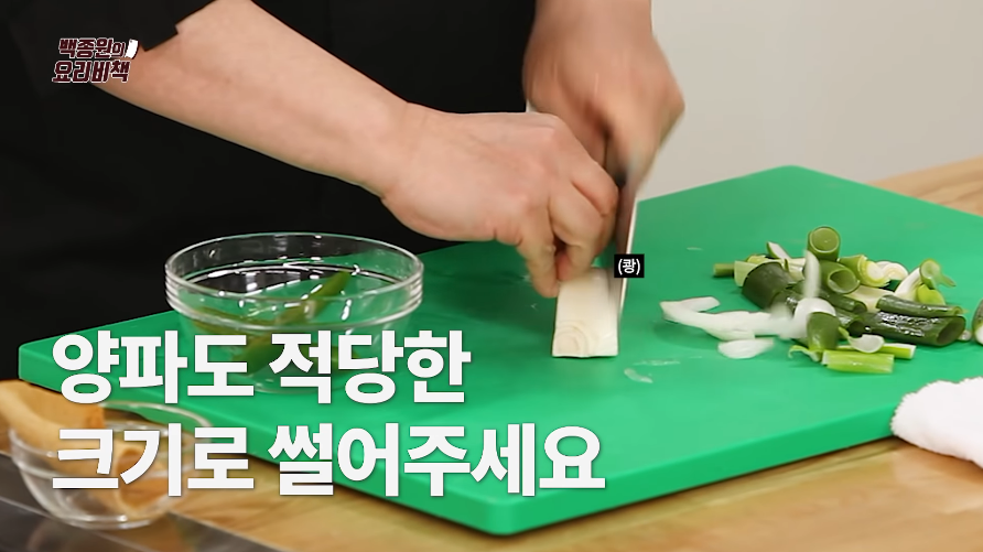 대파는 길게 반 갈라 5cm 정도 길이로 자른다.