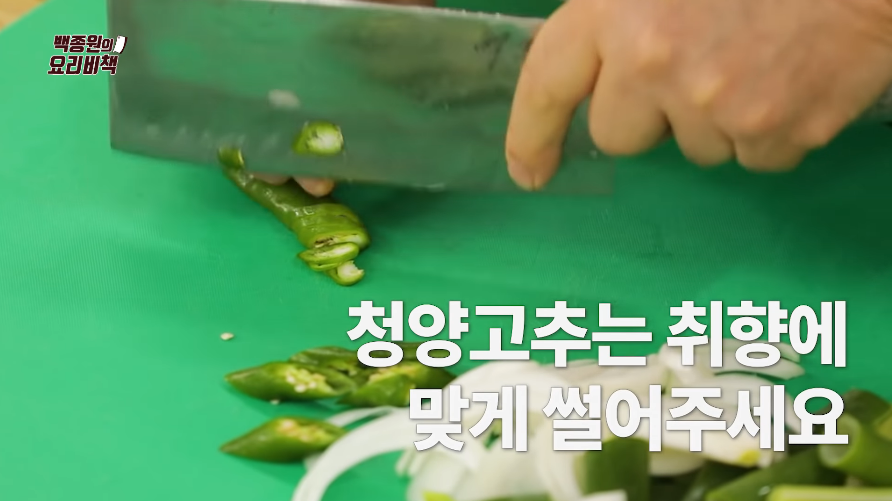 청양고추는 0.3cm 두께로 어슷썰기 한다.