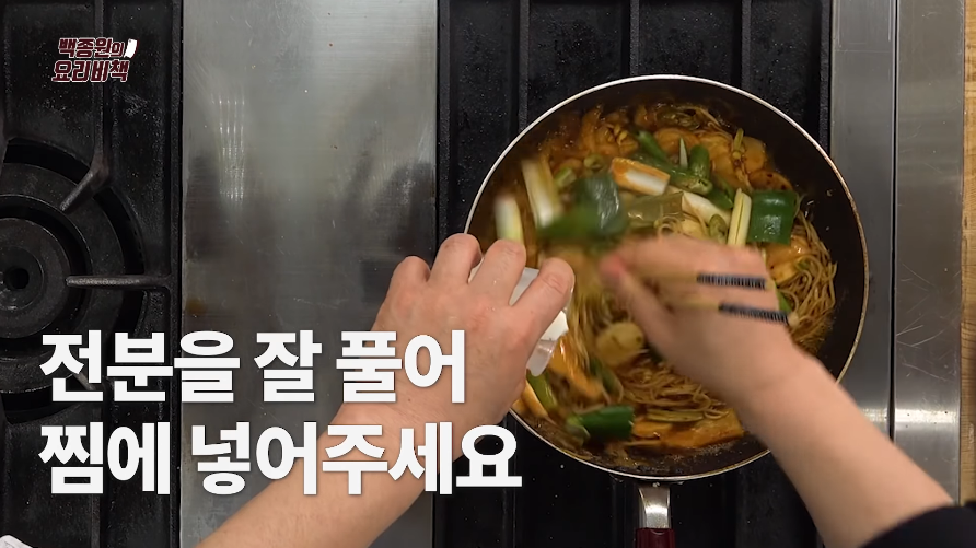 콩나물의 숨이 반 정도 죽으면 양념장을 넣고 젓가락을 이용하여 살살 섞는다.
