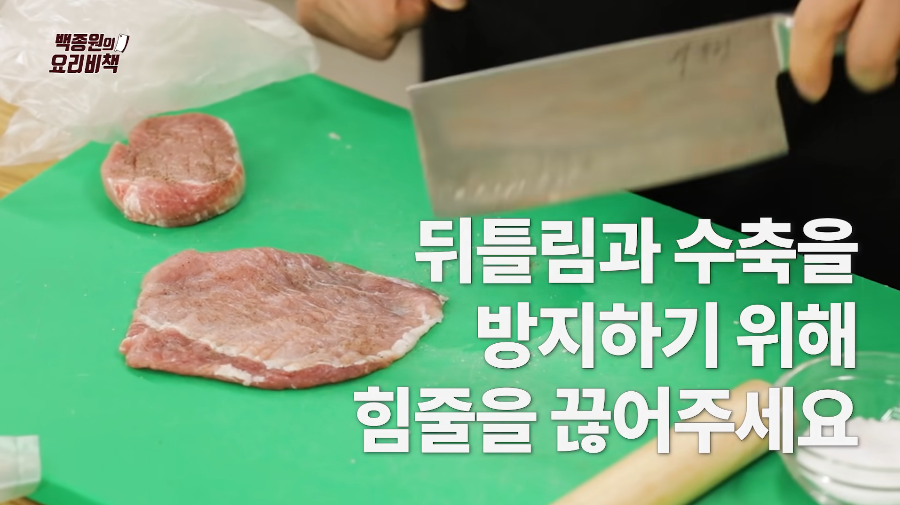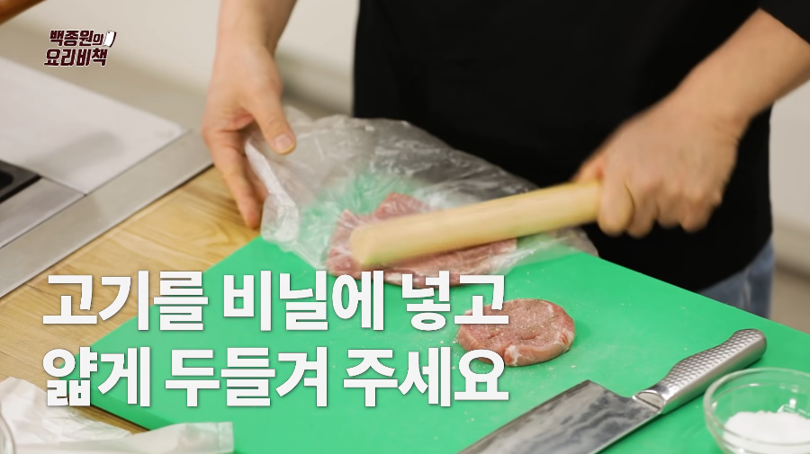 등심을 비닐팩에 넣고 밀대로 두드려주며 넓게 펼쳐준 후, 칼집을 넣어 힘줄을 끊어준다.