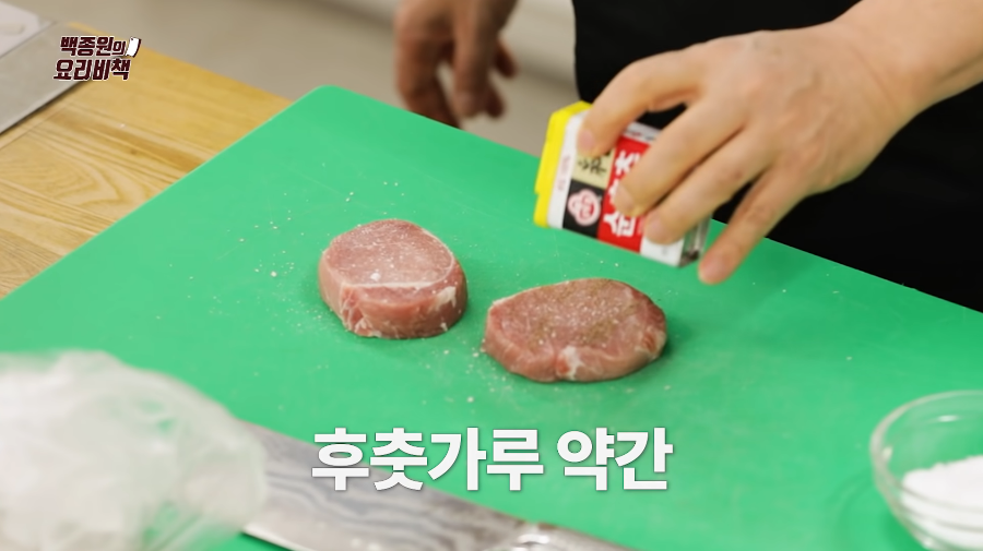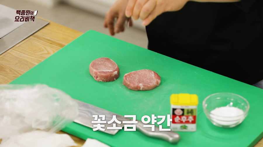 등심에 꽃소금, 후춧가루를 앞뒤로 살짝 뿌려 밑간을 해준다.