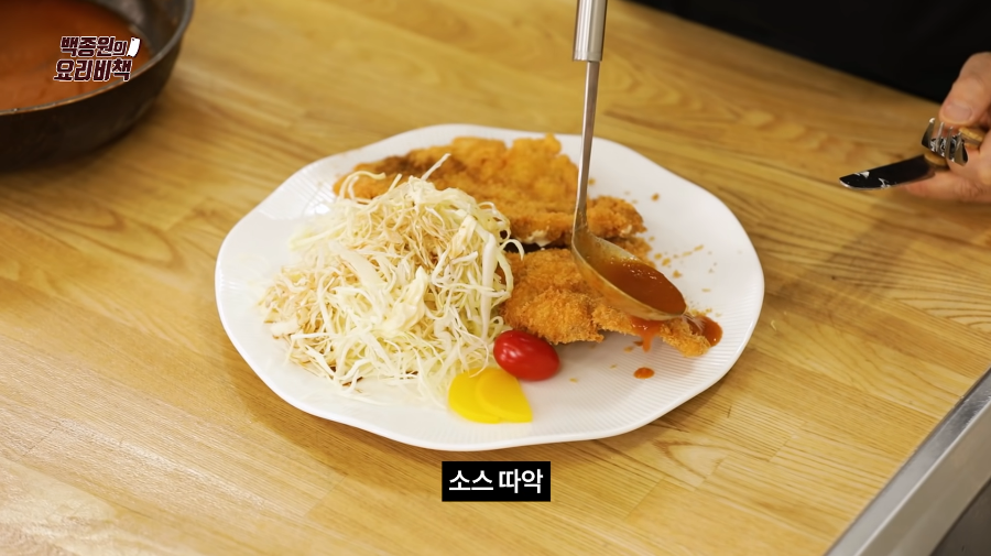 세팅 접시에 돈가스를 올리고 소스를 부어 마무리한다.
