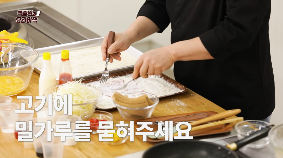 넓게 펴준 등심에 밀가루를 골고루 묻힌 후, 달걀물을 묻혀주고, 빵가루로 덮은 후 꾹꾹 눌러 준비한다.
