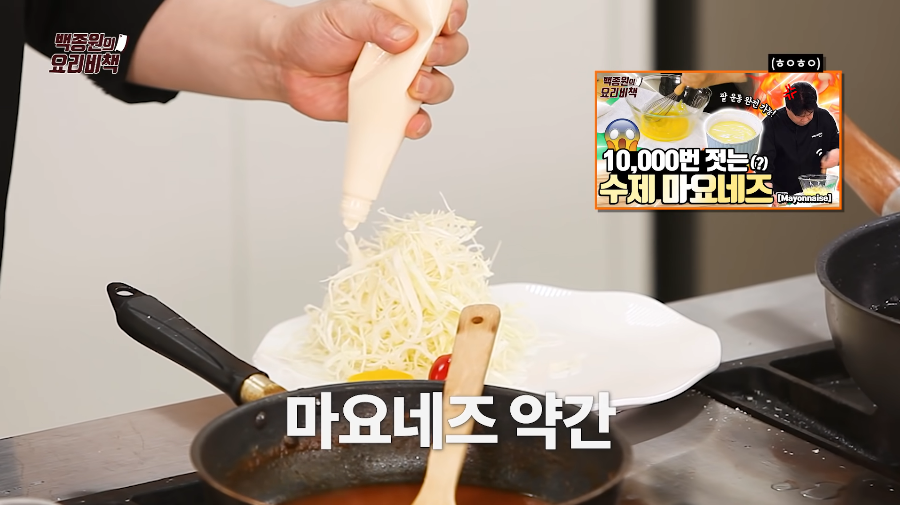 *양배추채 샐러드 위에 마요네즈, 우스터소스를 뿌려 먹으면 좋다.