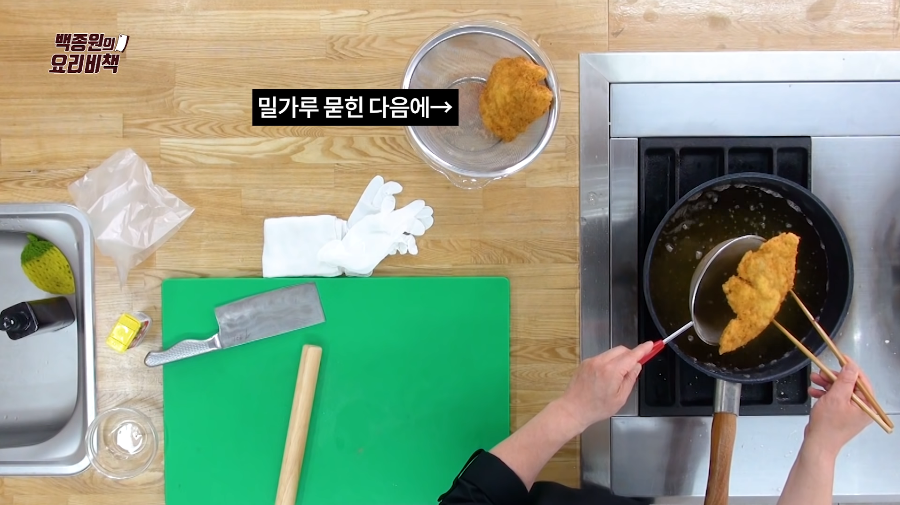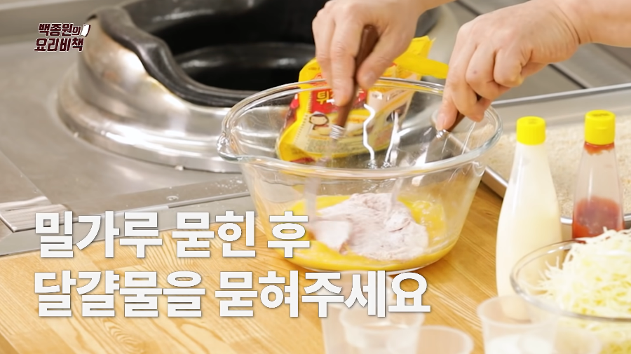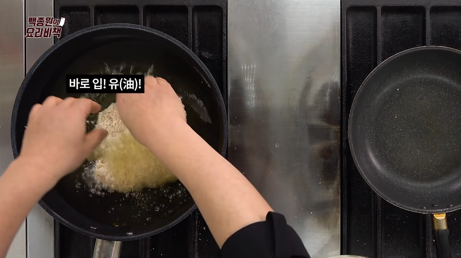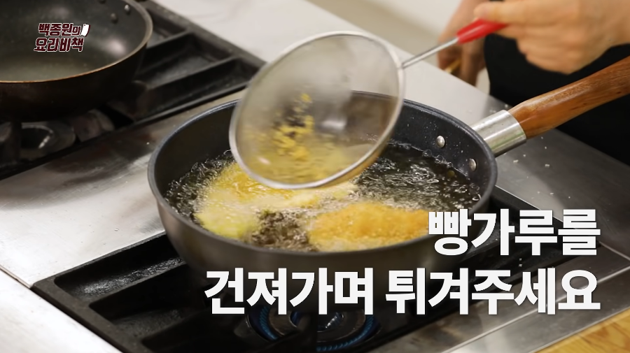 *튀기는 중에 빵가루를 중간중간 걷어내 주어야 기름을 오래 사용할 수 있다.