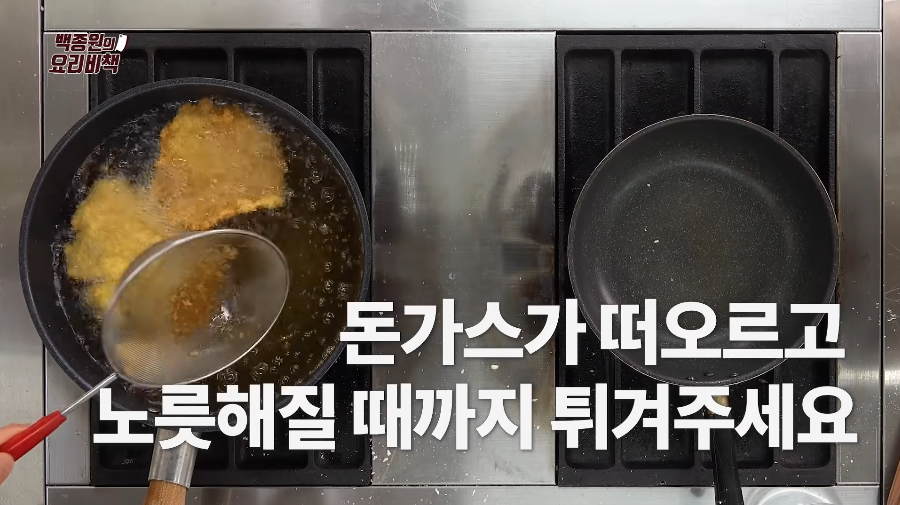 튀김옷을 입힌 돈가스를 넣고 앞뒤로 노릇한 색이 나도록 약 3분 20~30초간 튀겨준다.
