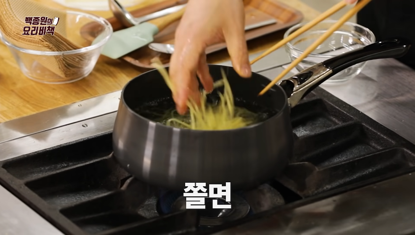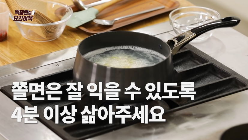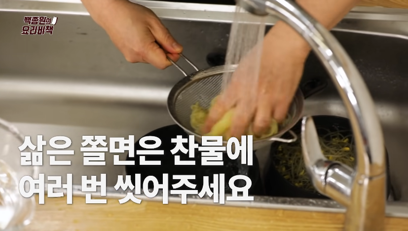 물이 바글바글 끓으면 풀어 둔 면을 넣고 약4분정도 삶아 찬물에 여러번 헹궈 물기를 제거하여 준비한다.
