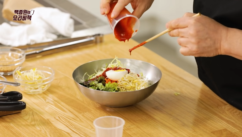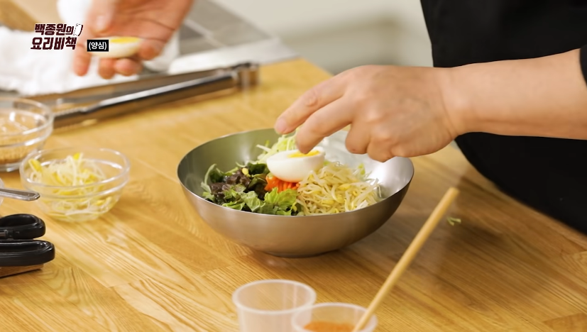 그릇에 삶아 둔 면을 담고 준비해 둔 채소, 삶은 달걀, 양념장, 통깨를 올려 완성한다.