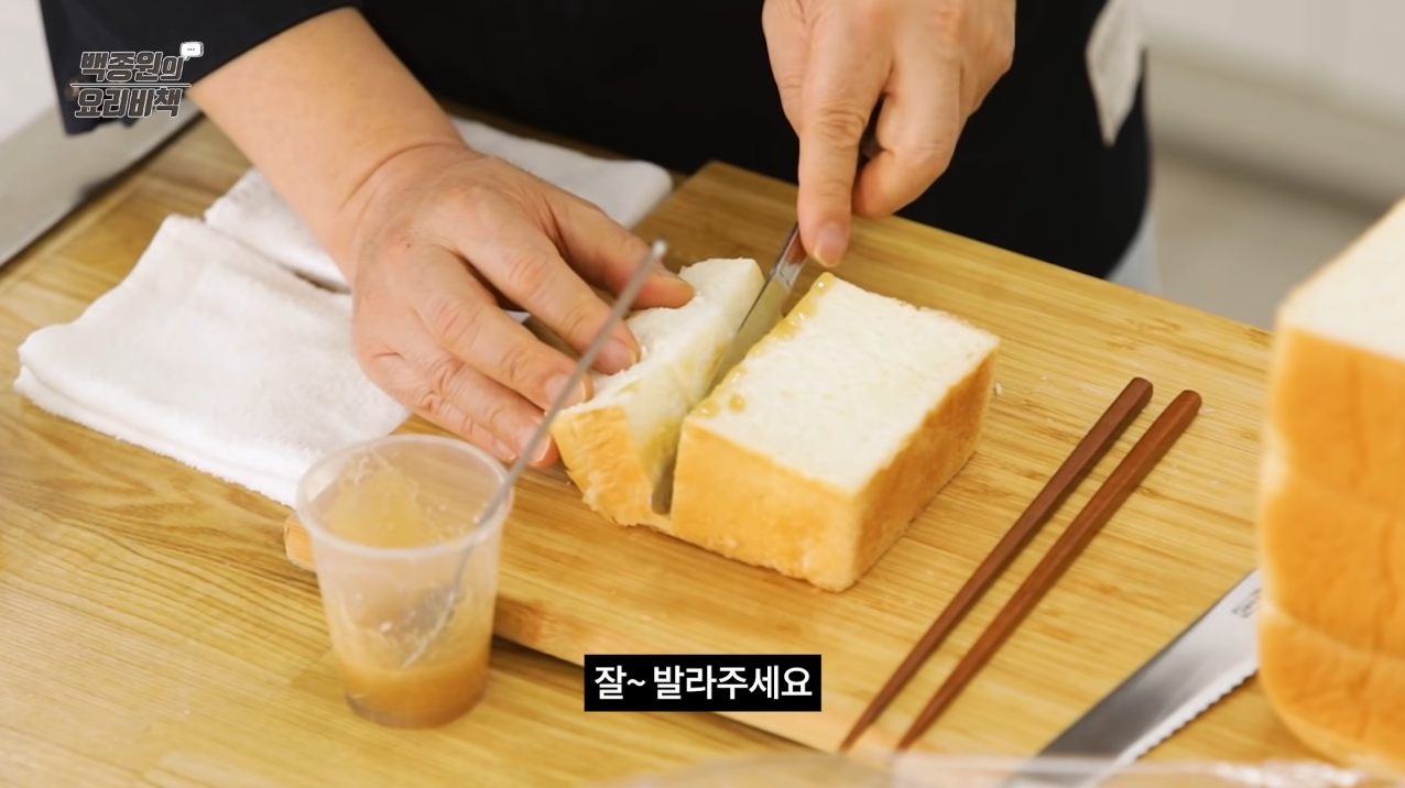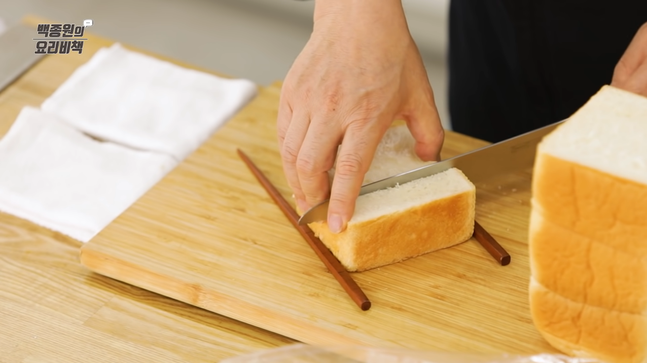 Tip: 나무 젓가락을 식빵 양쪽 면 아래에 대고 자르면 쉽게 자를 수 있다.