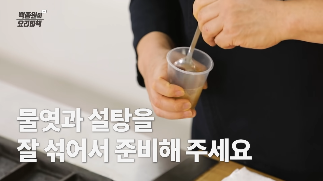 물엿과 설탕을 함께 넣고 잘 저어 시럽을 만들어 준비한다.