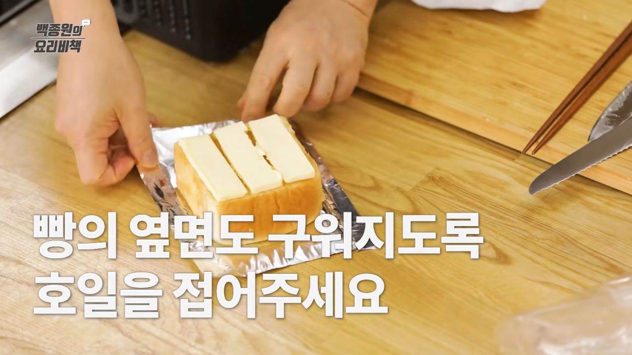 Tip: 쿠킹호일을 바닥에만 펼쳐 깔아야 빵 옆 쪽 부분까지 색을 골고루 낼 수 있다.