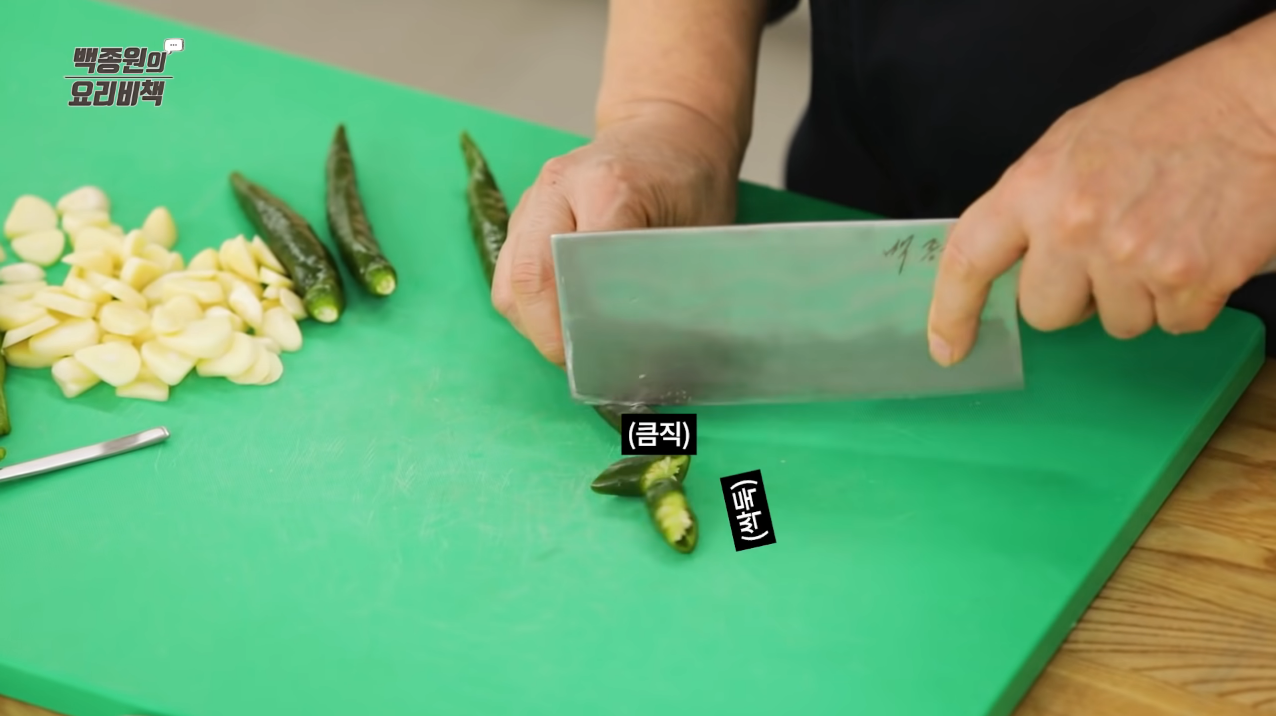 청양고추는 1cm 정도 두께로 어슷 썬다.