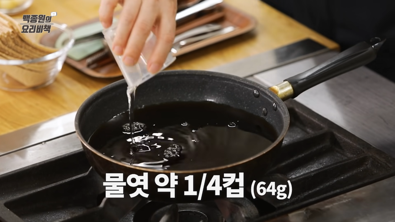 냄비에 물, 진간장, 황설탕, 물엿을 넣는다.