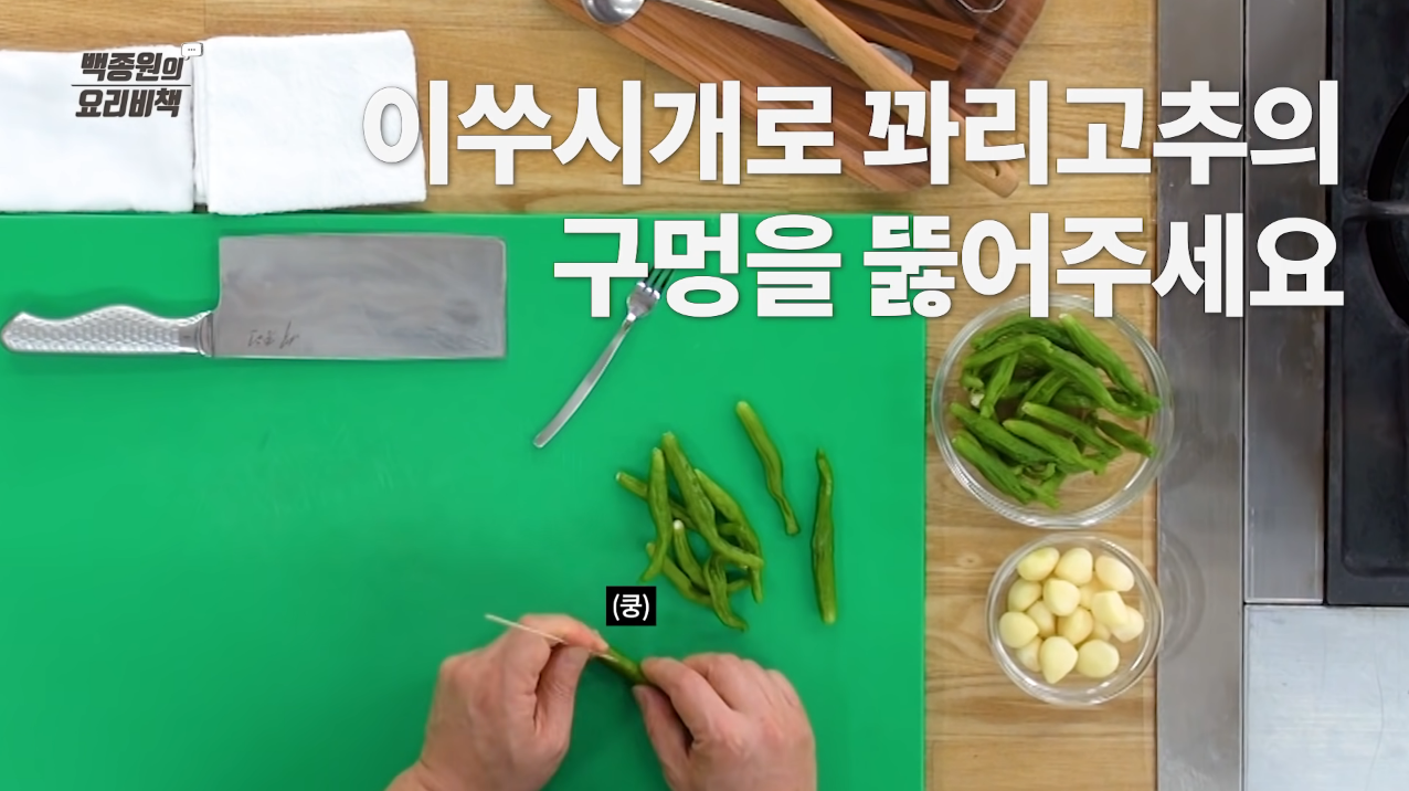 꽈리고추는 이쑤시개를 이용해 3~4번 찔러 구멍을 낸다.