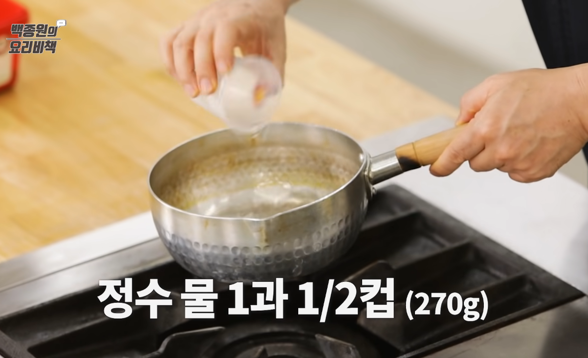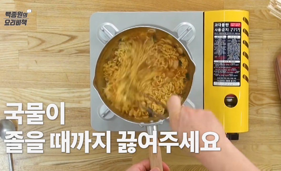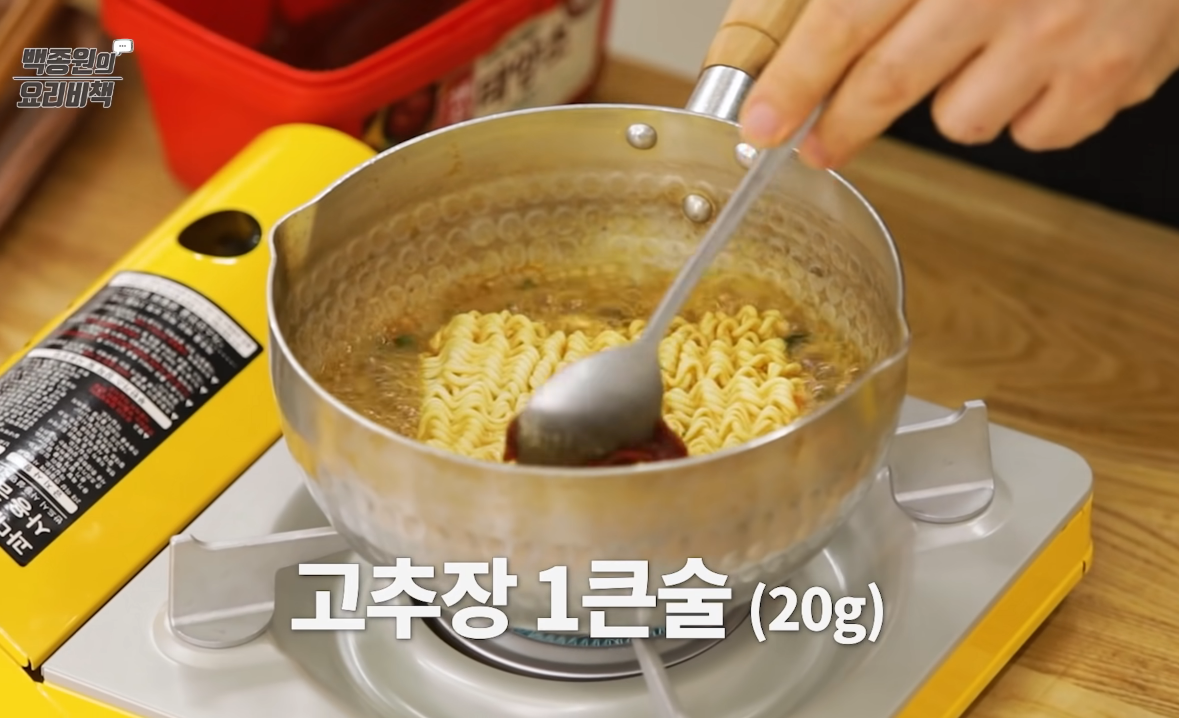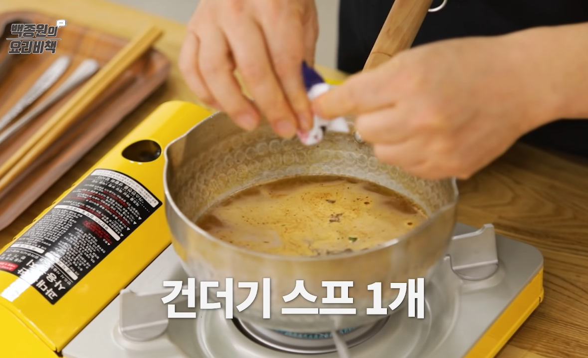 냄비에 물, 분말스프(1/2~2/3), 건더기스프, 설탕, 고추장을 넣고 풀어주며 끓인다.
