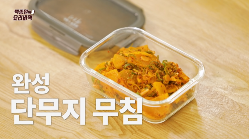 완성된 단무지 무침은 밀폐 통에 담아 냉장 보관한다.