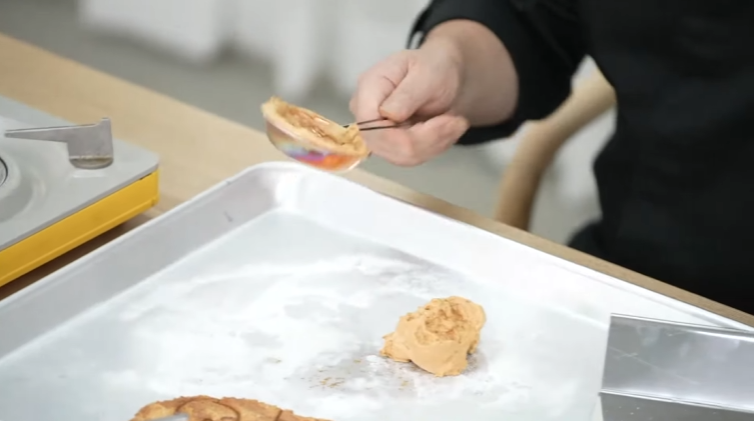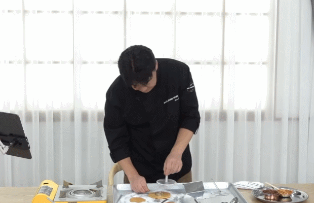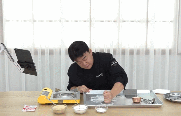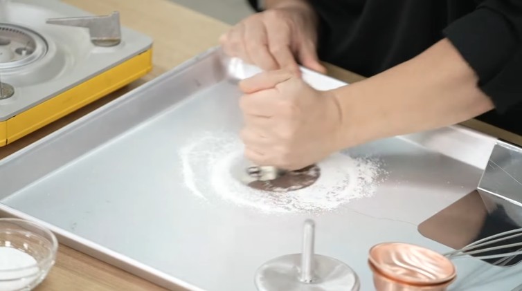 설탕 파우더 만든 판에 달고나를 부어주고 호떡 누르개로 눌러준다.