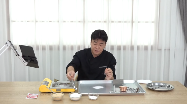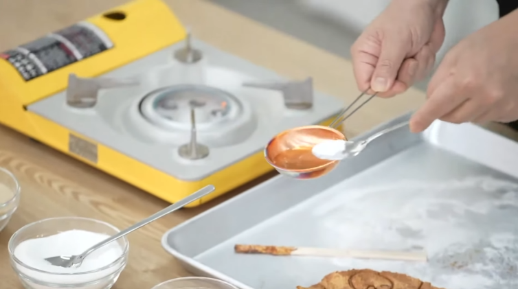 설탕에 베이킹소다를 넣고 막대로 저어서 만드는 한국의 사탕