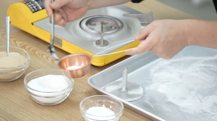 판에 설탕 2숟가락을 넣고 갈아 설탕 파우더를 만든다.