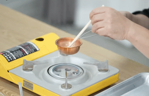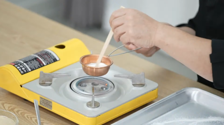 국자에 설탕을 넣고 국자를 올렸다 내렸다 하며 온도 조절을 하면서 녹을 때까지 저어준다.