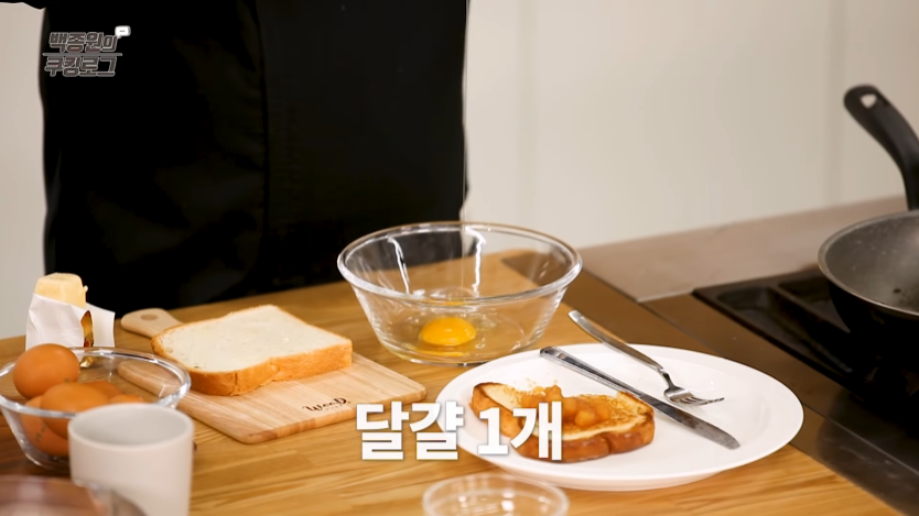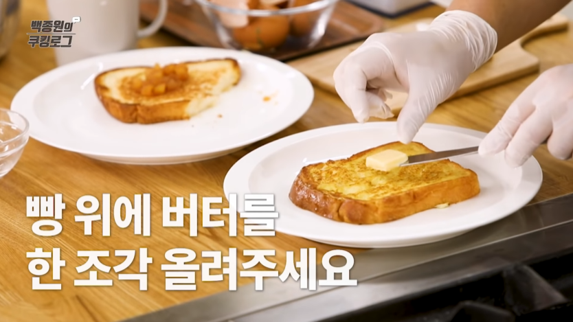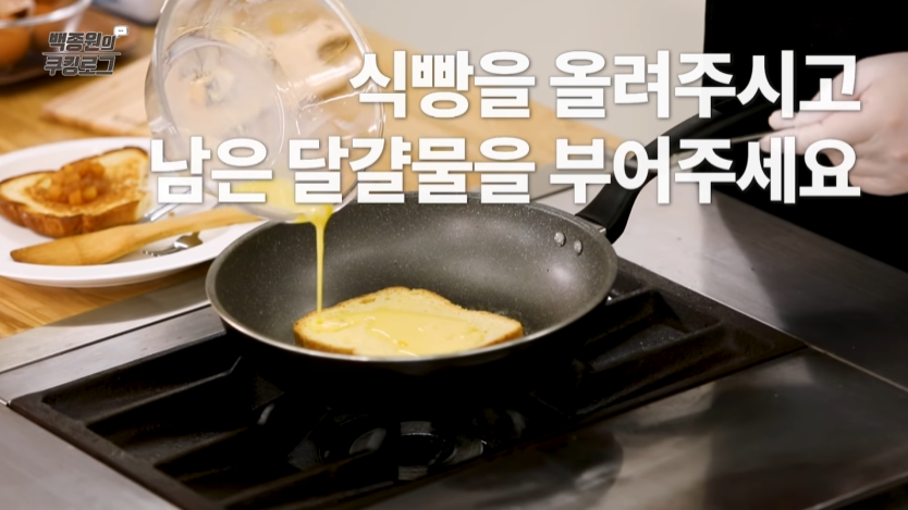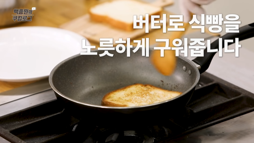 프라이팬에 토스트용 버터를 두르고 식빵을 올려 중불에서 노릇하게 구워준다.