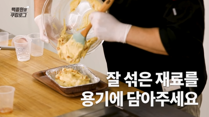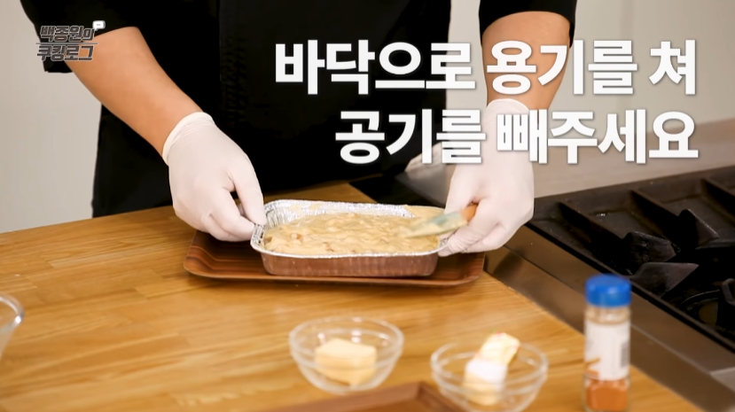 반죽을 오븐 용기에 넣고 바닥에 용기를 쳐 공기를 제거한다.