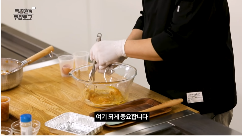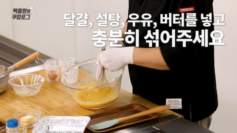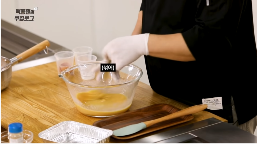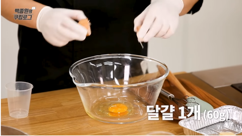 큰 볼에 달걀, 황설탕을 넣고 설탕을 녹을 때까지 거품기를 이용하여 섞어준다.