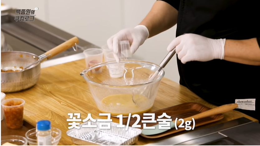 달걀물과 우유가 골고루 섞이면 꽃소금을 넣고 버터를 조금씩 넣어가면서 섞는다.