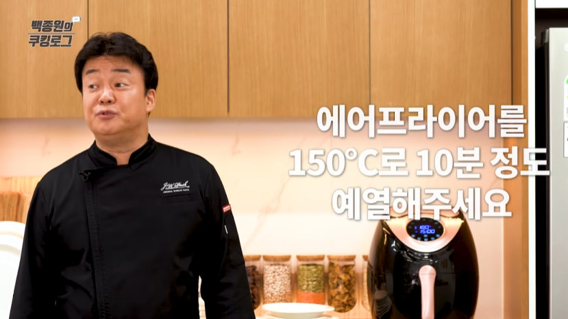 에어프라이어를 150도에 10분 정도 예열한 후 반죽이 담긴 용기를 넣고 30분 굽는다.