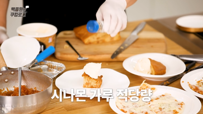 바닐라 아이스크림, 시나몬 가루를 곁들여 완성한다.