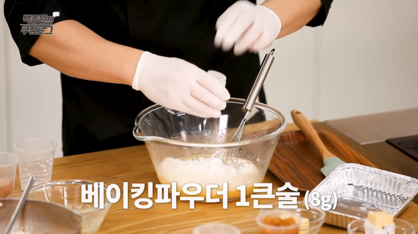 버터가 골고루 섞이면 중력분, 베이킹파우더를 넣고 뭉치지 않도록 섞어준다.