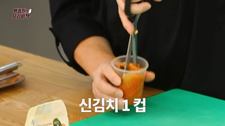 신김치는 가위를 이용하여 잘게 잘라 준비한다.