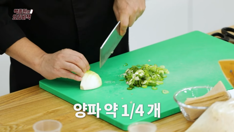 대파, 청양고추는 두께 0.3cm로 송송 썰고 양파는 사방 0.5cm 정도로 잘게 썰어 준비한다.