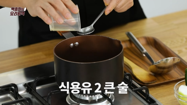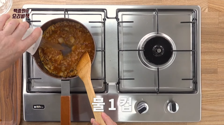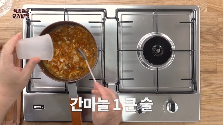 새우젓과 신김치가 기름에 볶아지면 물, 양파, 간 마늘을 넣고 강불에 끓인다.
