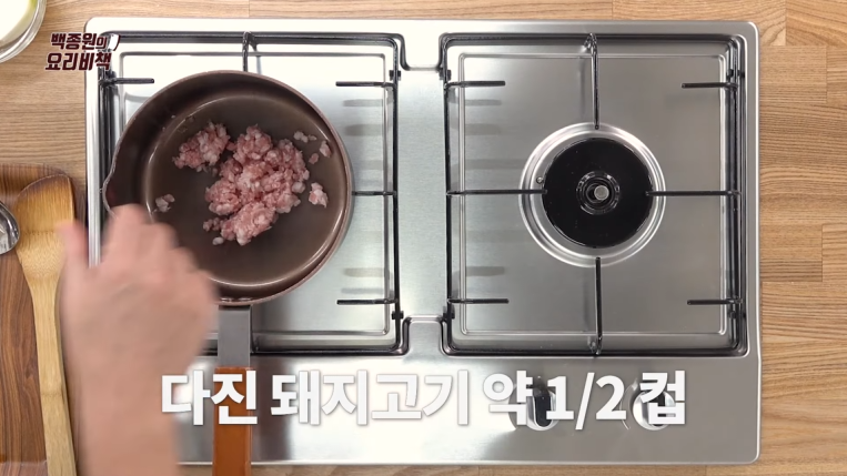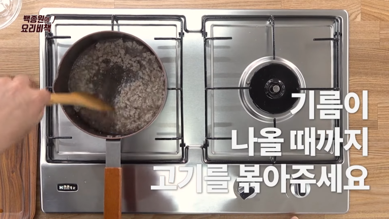 냄비에 다진 돼지고기, 식용유, 참기름을 넣고 강불에 볶는다.