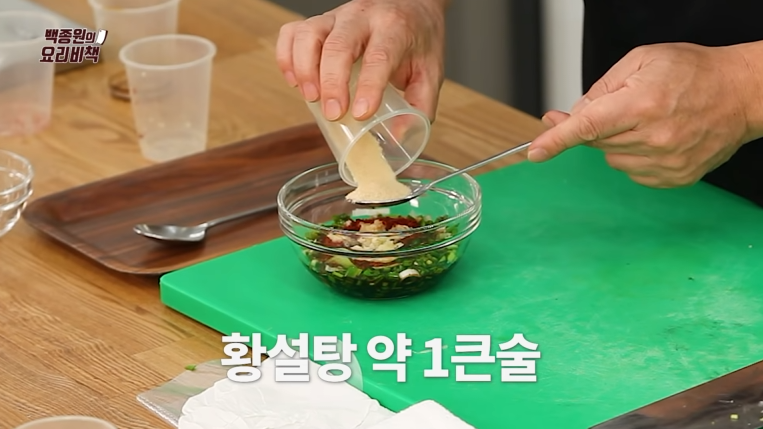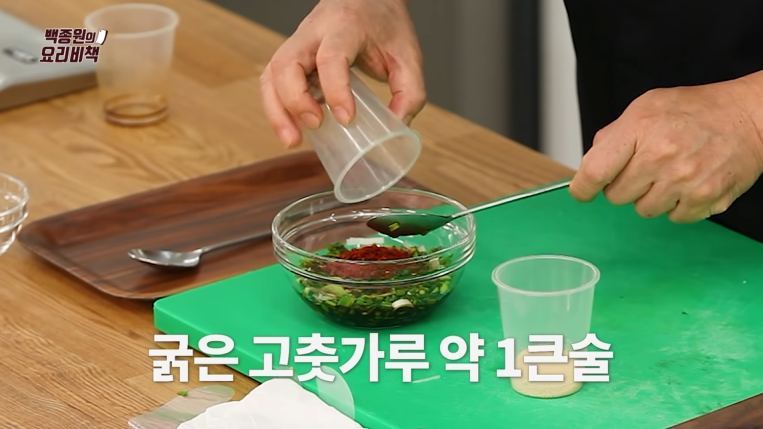 굵은 고춧가루, 간 마늘, 황설탕을 넣고 섞는다.