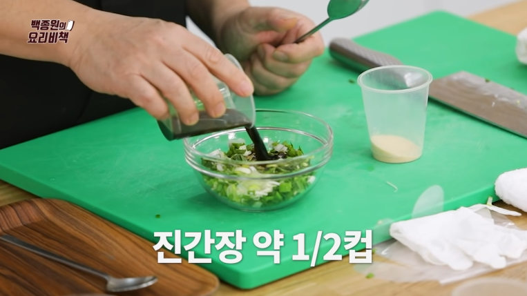 깊은 그릇에 부추, 청양고추, 대파를 넣고 진간장을 넣는다.
