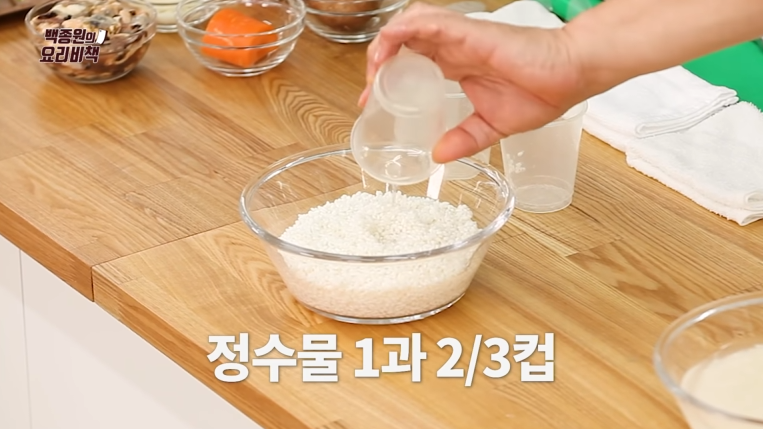불린 쌀은 체에 밭쳐 물기를 제거한 후 전기밥솥에 넣고 정수물을 붓는다.