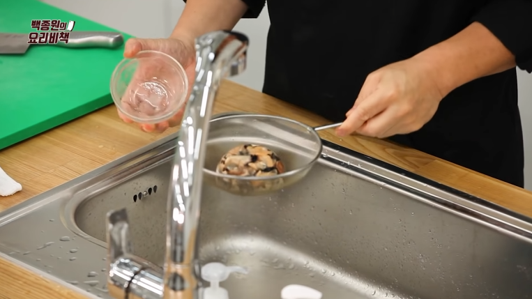 홍합살은 체에 밭쳐 흐르는 물에 세척한 후 물기를 제거하여 준비한다.