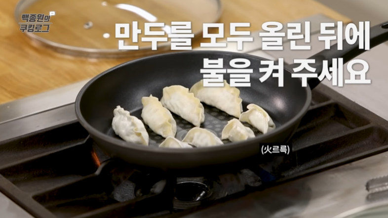 프라이팬에 만두를 넣고 불을 켠다.