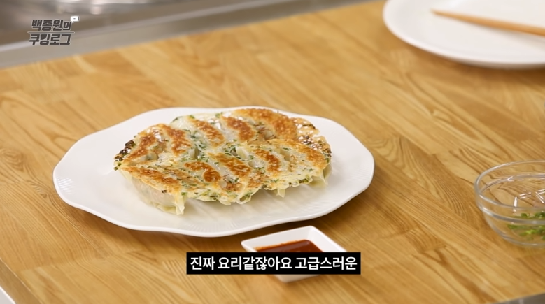 바닥이 안 탔으면 만두 전체를 뒤집어 보기 좋게 접시에 올린다.