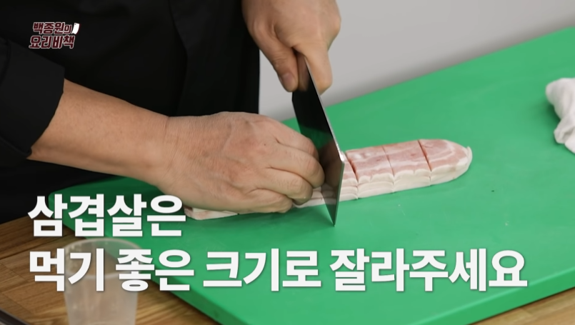 삼겹살을 4cm 정도 길이로 잘라 준비한다.