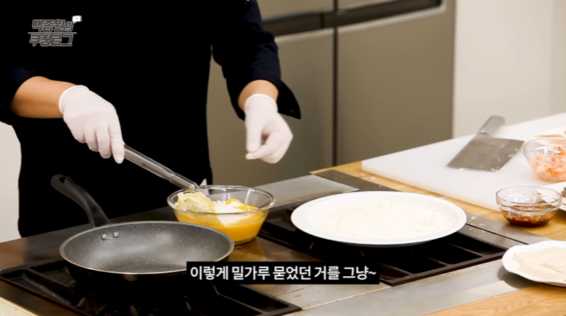 배추에 밀가루를 묻힌 후 달걀물을 묻힌다.