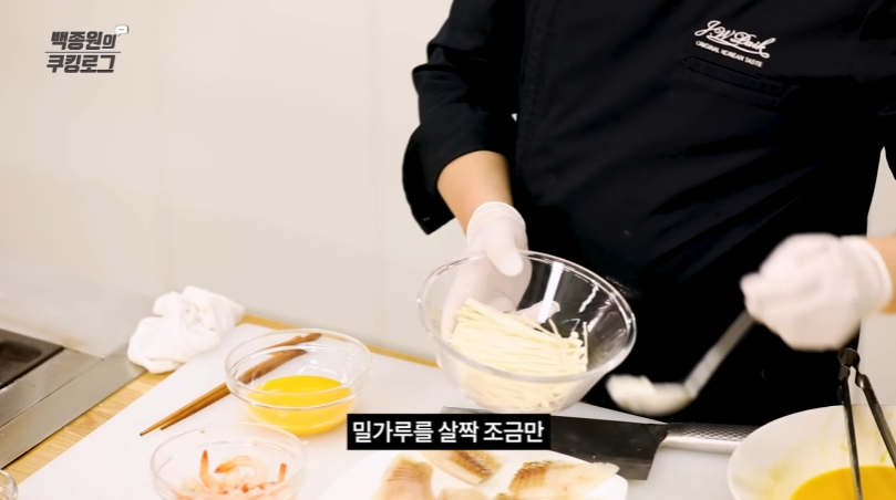 새송이버섯, 팽이버섯, 느타리버섯은 밀가루를 뿌려 골고루 묻혀주고 달걀물에 넣어 섞어준다.