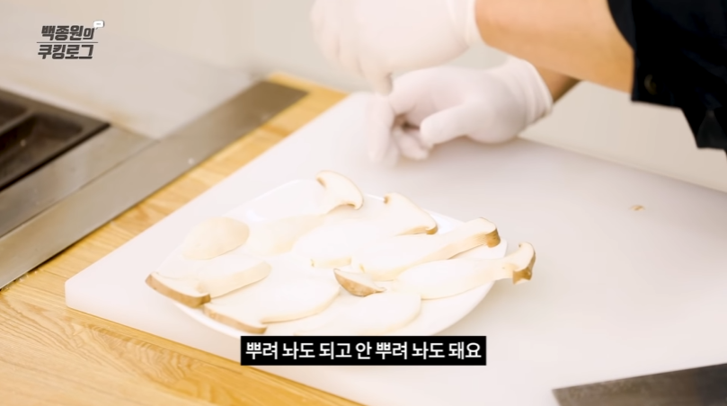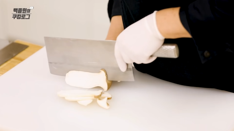 새송이버섯은 밑동을 정리한 후 0.5cm 두께로 잘라 준비한다.
