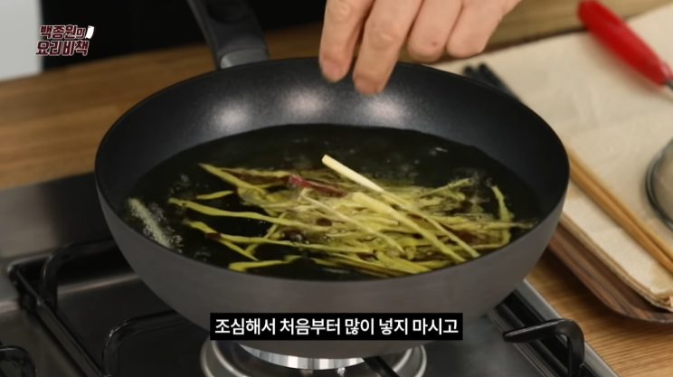 깊은 프라이팬에 식용유를 붓고 약 160-170도로 예열한다.