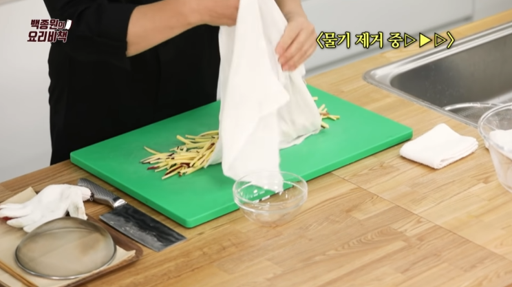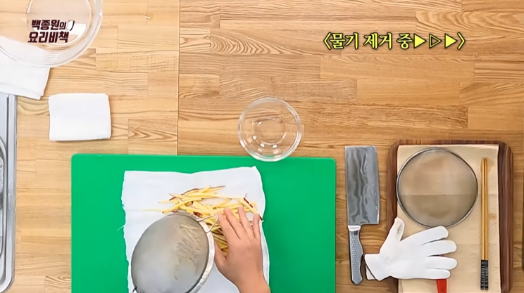넓은 면보 위에 채 썬 고구마를 올린 후 물기를 완전히 제거한다.